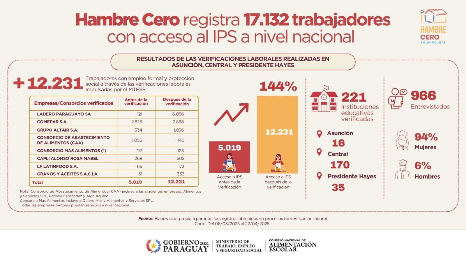 En los departamentos de Asunción, Central y Presidente Hayes, donde se realizaron operativos de control, se detectó un incremento del 144% en la cantidad de trabajadores registrados en el IPS. Antes de las verificaciones, 5.019 trabajadores contaban con cobertura social; luego de los controles, la cifra ascendió a 12.231.