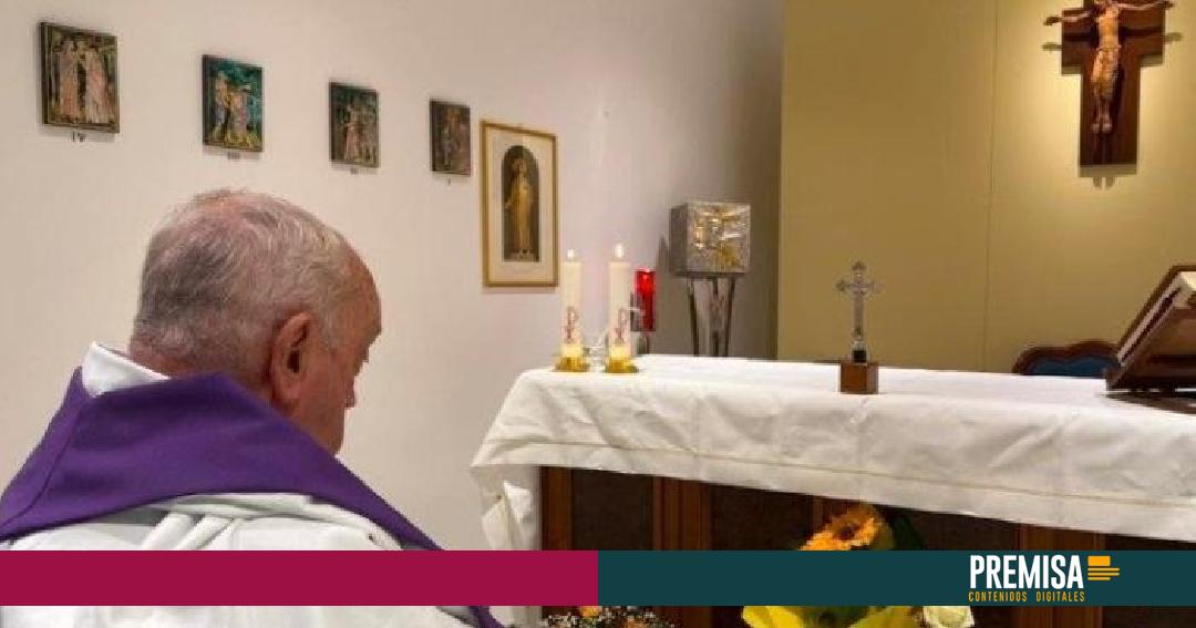 En la foto, el papa aparece en silla de ruedas frente al altar, vestido de blanco y con una estola morada, el color que se utiliza durante las celebraciones en el periodo de Cuaresma, con ocasión de la misa de esta mañana.