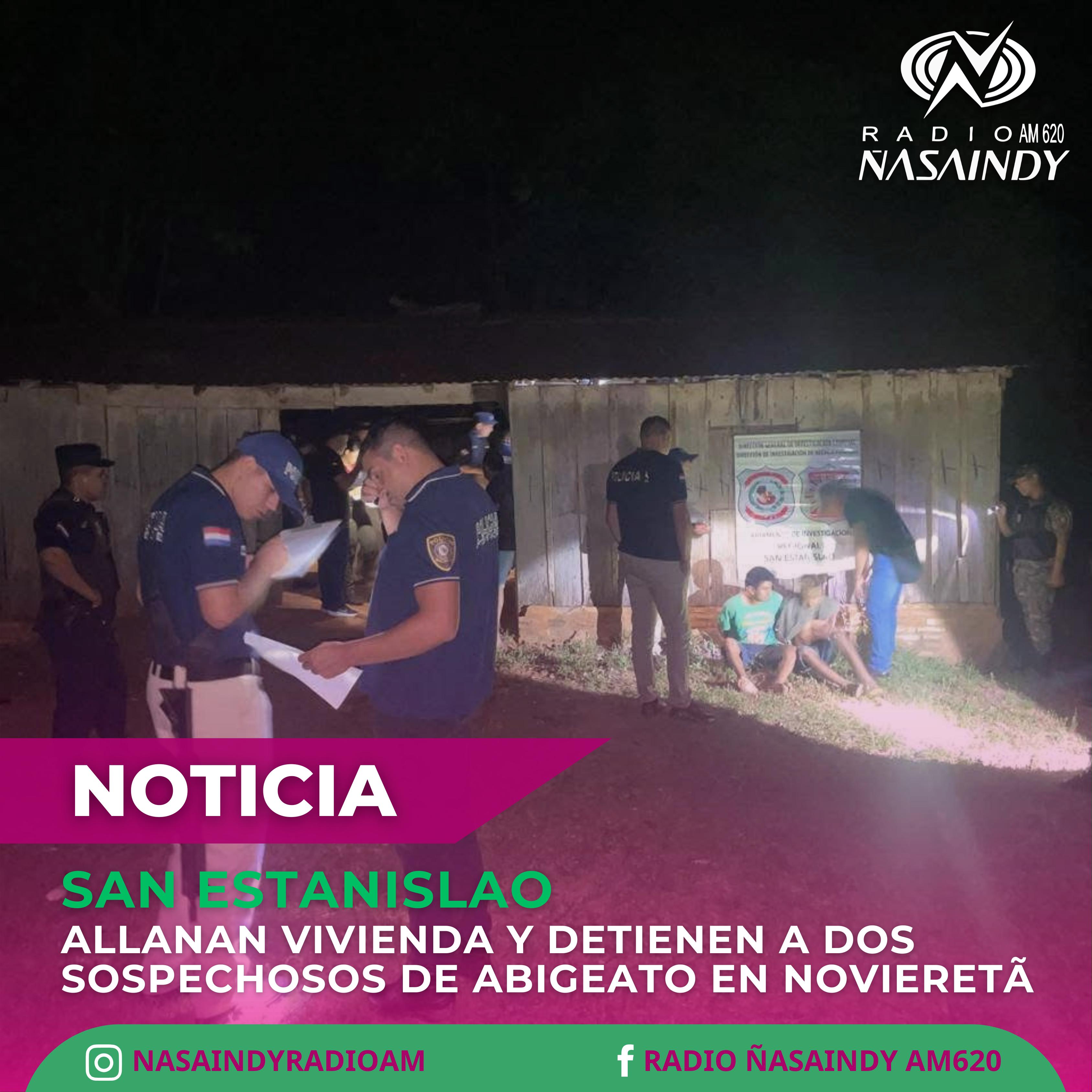 Novieretã. – En un operativo contra el abigeato, fueron detenidos Roberto Carlos Méndez (21) y Diosnel González (31), quienes ya contaban con órdenes de captura. El allanamiento se llevó a cabo en la comunidad de Noviretã, donde las autoridades lograron localizarlos tras el rastreo de llamadas.